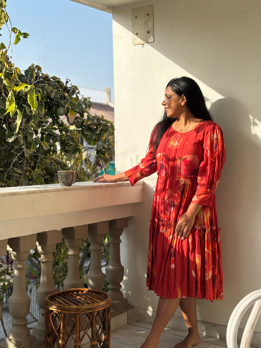 Radiant in Red: Hand-Block Pleated Cotton Dress